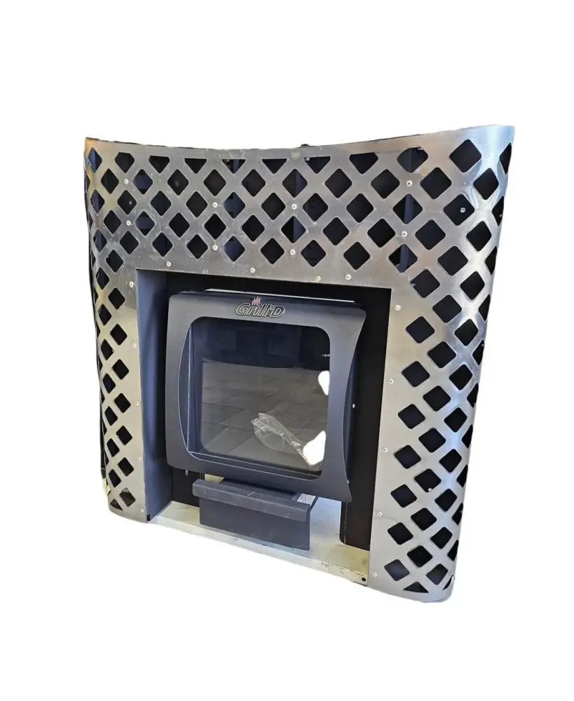 Декоративный экран Grill`D изготавливается из исключительно прочных и качественных материалов. Данный аксессуар служит как защита прилегающих конструкций топливного канала от грязи, а также прекрасно дополняет и украшает банную печь. Размещается рамка вокруг дверки топки в смежном помещение от парной.