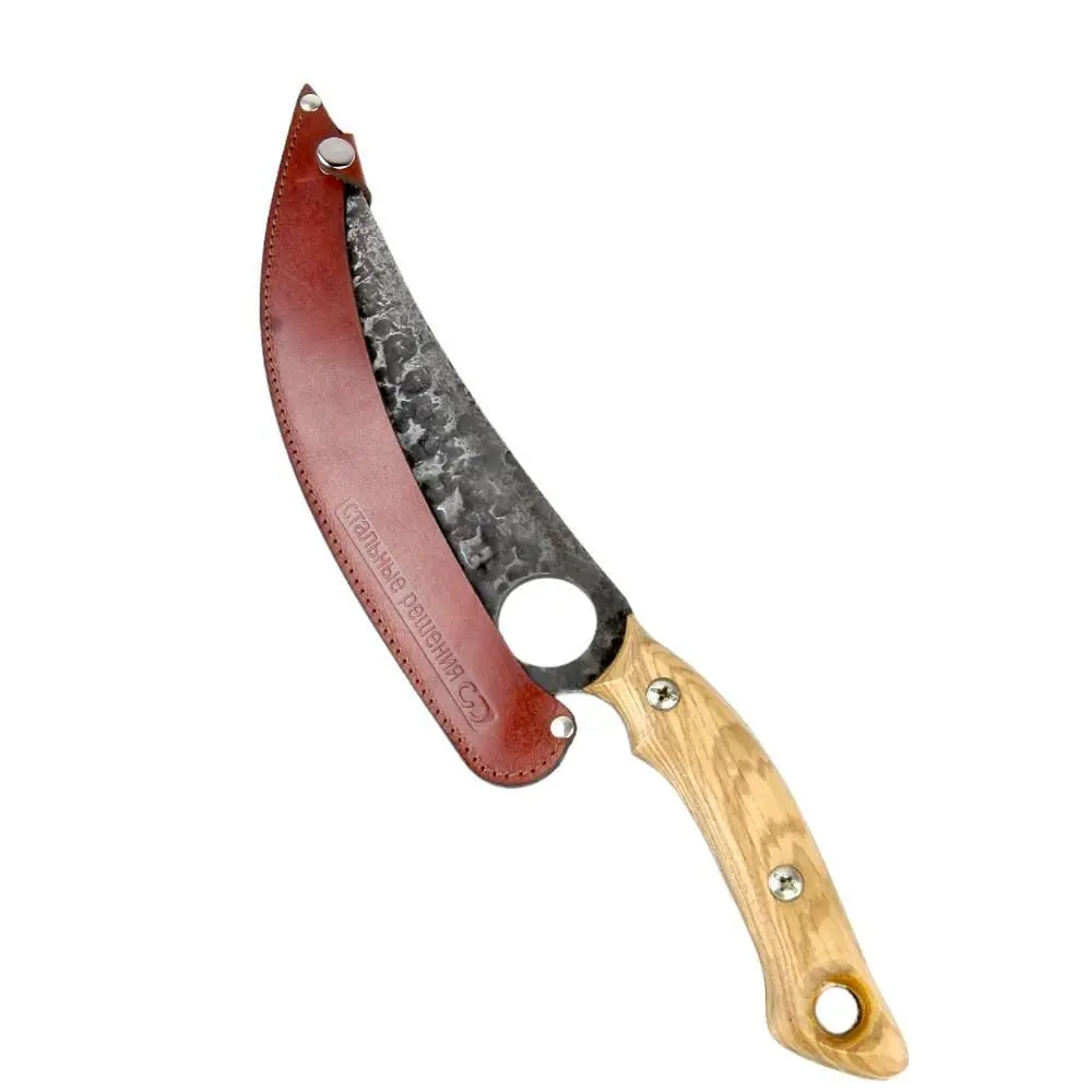 Изготавливается из цельнолистовой углеродистой конструкционной стали марки ст45. Толщина стали – 4 мм. Режущая кромка имеет базовую заточку с длиной лезвия 20см. Рукоятка изготовлена из ясеня, обработана маслом и имеет удобный хват. Заготовки проходят закалку в горне, а затем отковываются на механическом молоте и вручную. Рабочее лезвие защищено от ржавчины покрытием в технике “воронение”.