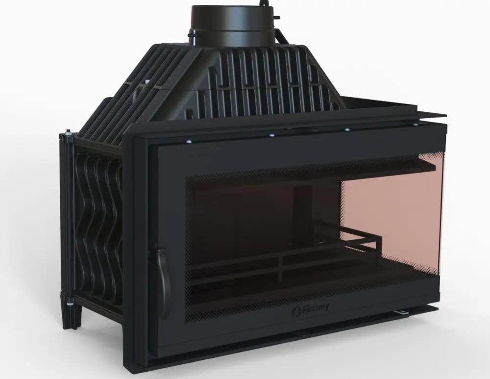 Изнутри топка защищена чугунной футеровкой по задней стенке и зубом, на дне размещена колосниковая решетка. В нижней части топки, за общей дверцей размещен выносной ящик для золы. Прибор оснащен съемным вертикальным ограждением (гребнем), являющимся ограничителем дров в топке. Каминная топка может подключаться к дымоходу с только верхней стороны.