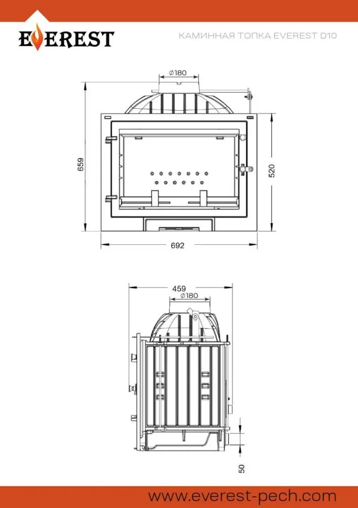 Чугунная топка EVEREST D10 – пристенная конструкция, предназначенная для отопления помещений объёмом до 250 м³.
