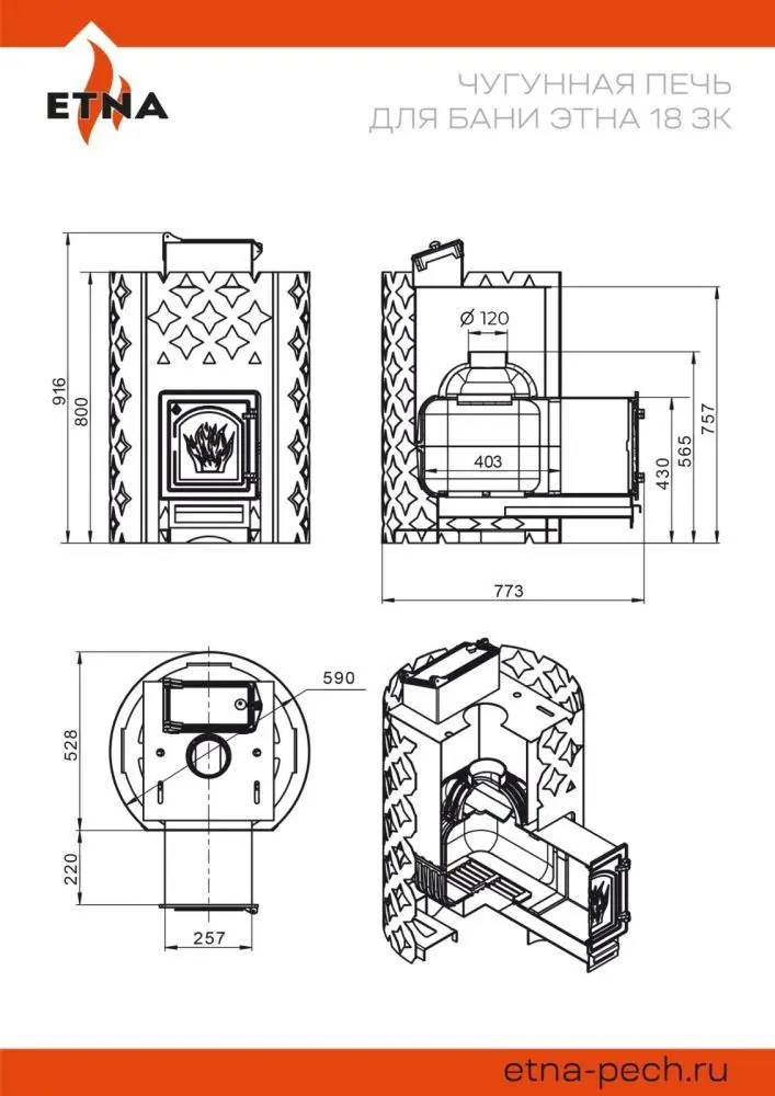 Чугунная банная печь этна ЗК 18 (ДТ-4С) оснащается остеклённой чугунной дверкой ДТ-4С и рассчитана на работу в парной объёмом до 18 кубических метров. С помощью этой модели обеспечивается быстрый равномерный прогрев парной, поддержание необходимой температуры и получение достаточного количества пара. Закрытая каменка представляет собой металлический короб, устанавливаемый сверху на топку печи и загружаемый камнями для бани средней фракции. Нагреваясь в ограниченном объёме, камни достигают более высокой температуры и при подаче воды выдают пар мельчайшей фракции, полезный для парящихся и не затрудняющий дыхание. Закрытая каменка изготовлена из особо прочной котловой стали толщиной 2 мм и для загрузки камней, а также подачи воды оснащена собственной дверкой ДП-2. Подача воды на камни осуществляется с помощью специального парогенератора, входящего в комплектацию печи. Парогенератор обеспечивает медленное капельное поступление воды на камни для более эффективного испарения.