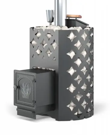 Чугунная банная печь этна ЗК 24(ДТ-4) оснащается глухой чугунной дверкой ДТ-4 и рассчитана на работу в парной объёмом до 24 кубических метров. С помощью этой модели обеспечивается быстрый равномерный прогрев парной, поддержание необходимой температуры и получение достаточного количества пара. Закрытая каменка представляет собой металлический короб, устанавливаемый сверху на топку печи и загружаемый камнями для бани средней фракции. Нагреваясь в ограниченном объёме, камни достигают более высокой температуры и при подаче воды выдают пар мельчайшей фракции, полезный для парящихся и не затрудняющий дыхание. Закрытая каменка изготовлена из особо прочной котловой стали толщиной 2 мм и для загрузки камней, а также подачи воды оснащена собственной дверкой ДП-2. Подача воды на камни осуществляется с помощью специального парогенератора, входящего в комплектацию печи.