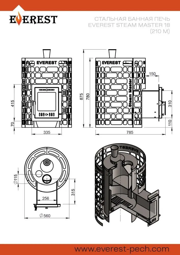 Печь для бани EVEREST Steam Master 18 (320М) изготовлена из особо прочной котловой стали марки 09Г2С и предназначена для установки в частные и коммерческие бани с объёмами парных помещений до 18 м³.