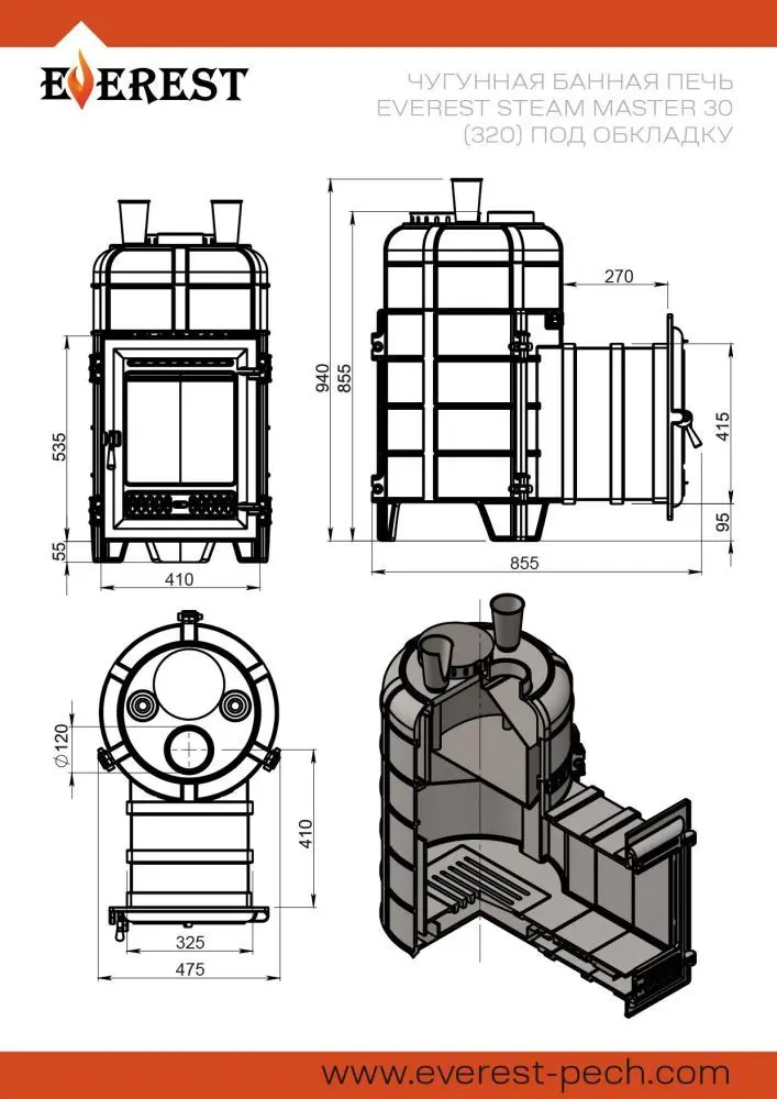Банная печь Эверест "Steam Master" 30 (320) ЧУГУН (под обкладку) предназначена для нагрева помещений и получения пара в парных объёмом до 30 кубических метров.