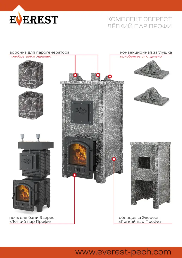 Поворотная чугунная банная печь EVEREST Лёгкий Пар ПРОФИ предназначена для обогрева парных помещений объёмом до 44 кубических метров и получения пара при эксплуатации в частных и коммерческих банях.