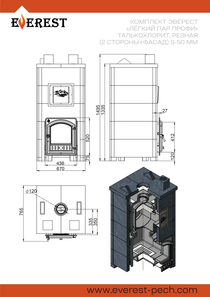 Печь состоит из двух модулей: топочной камеры и закрытой каменки из чугуна. Наиболее термонагруженные участки печи сделаны из жаропрочного чугуна толщиной 20 миллиметров.