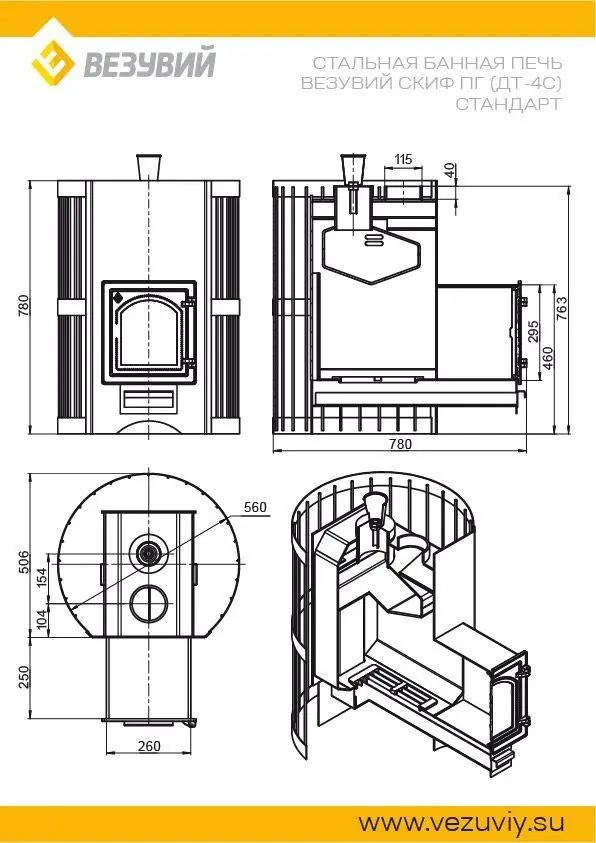 Печь изготовлена из особо прочной котловой стали 09Г2С, рассчитанной на работу при высоких температурах и давлении. Толщина стенок печи 4-6 мм. Топочный тоннель сделан из стали толщиной 4 мм, что позволяет топить дрова длиной более 50 см.