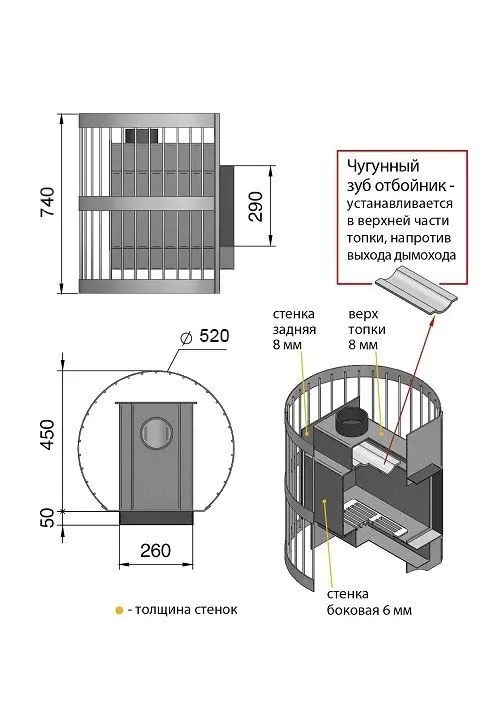 Данные Печи разработаны на основе изучения отечественных и зарубежных образцов. Преимущества таких печей: толщина металла, надежный сварной шов, увеличенный срок службы. Эту печь можно нагружать большим количеством камней и смело ставить на нее бак с водой. Данные печи изготовлены из конструкционной стали толщиной до 8мм и имеют минимальное количество сварных швов, а в самых уязвимых местах подверженных воздействию высоких температур используются детали, отлитых из чугуна (колосник, зуб отбойник) На всех печах установлены чугунные дверцы в отличии от металлической дверцы чугунные не деформируются и стекла на них не трескаются.