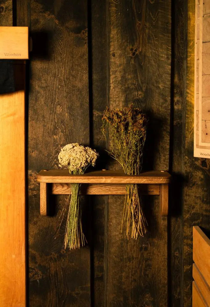 Полка для трав и веников Woodson mini изготовлена вручную из массива ольхи и дуба.